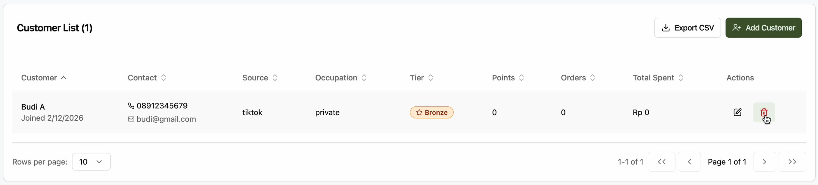 Di dalam Customer List, klik ikon 🗑️ pada baris pelanggan.