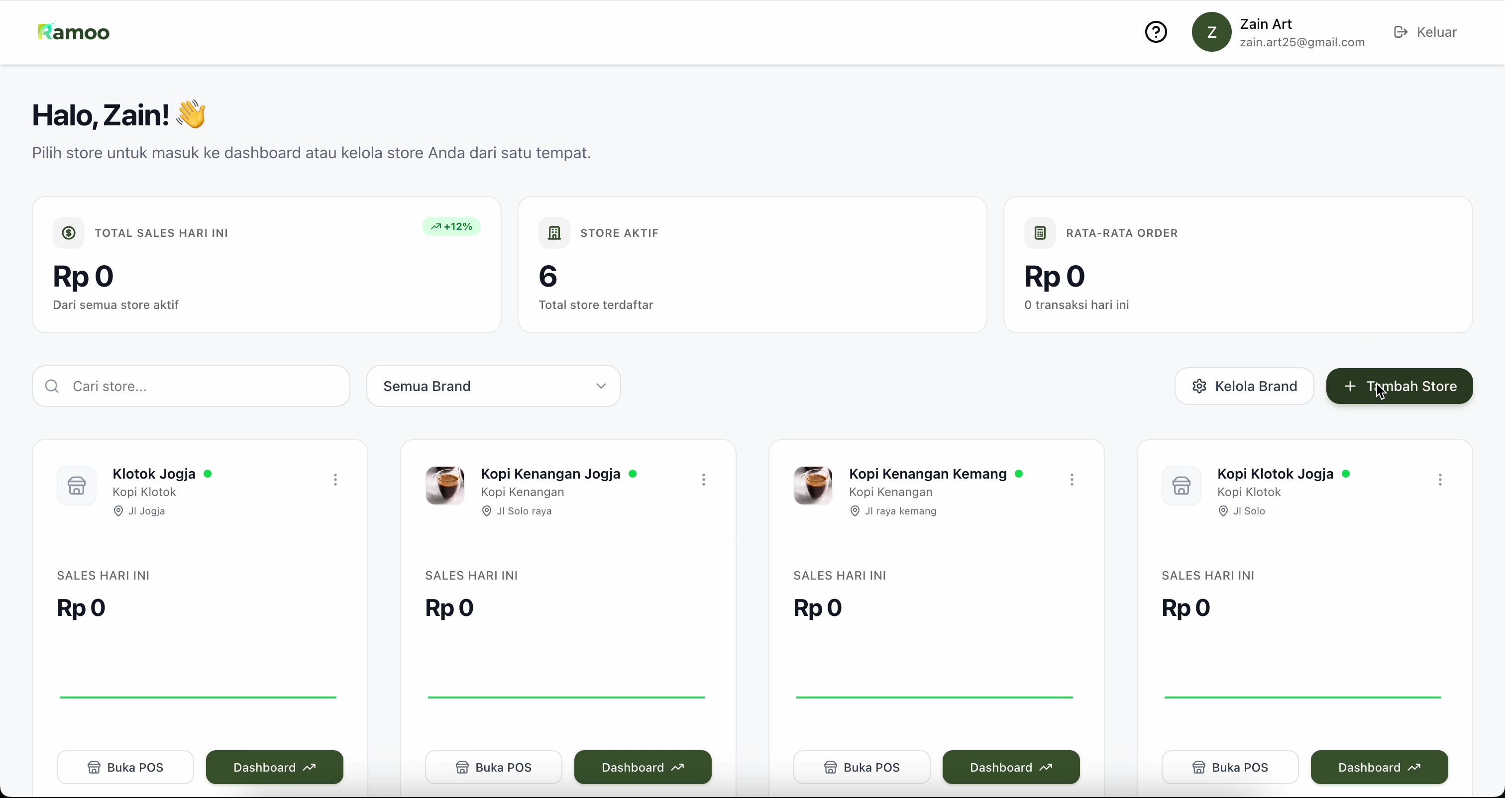Di Ramoo, kamu bisa mengelola banyak merek (Brand) dan cabang (Store) dalam satu akun. Proses ini adalah langkah awal untuk memasukkan data operasional bisnis kamu ke dalam sistem.
