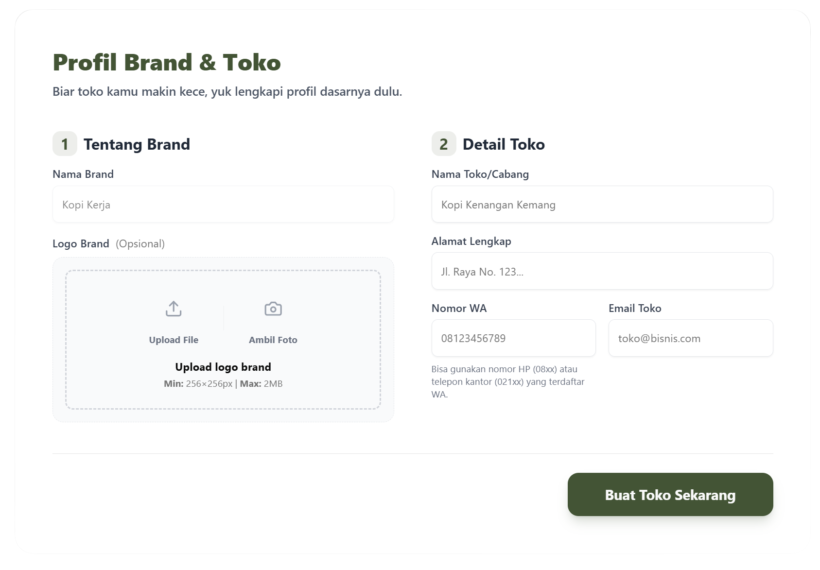 - Logo Brand: Upload logo (Maks. 2MB) untuk struk & dashboard.