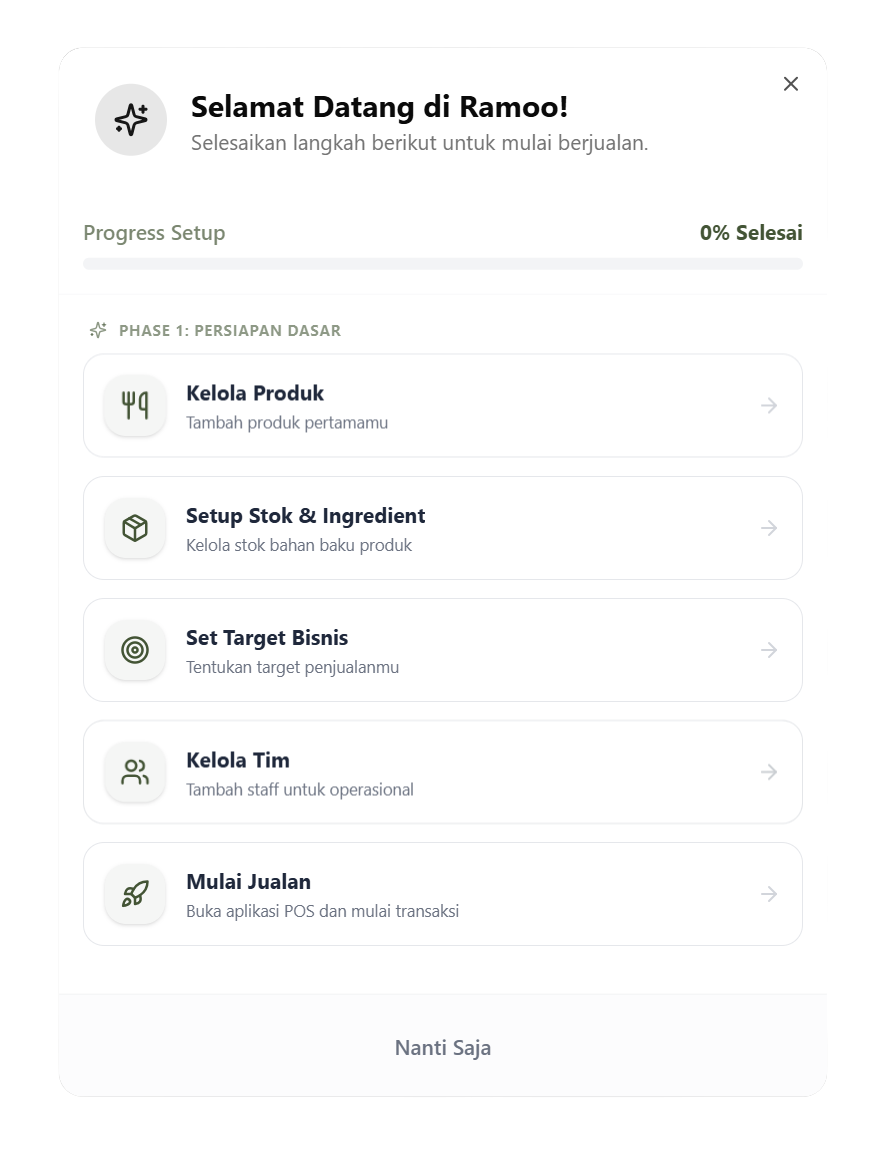 Setelah toko berhasil dibuat, kamu akan melihat popup "Selamat Datang di Ramoo!" yang menampilkan progres persiapan toko kamu.