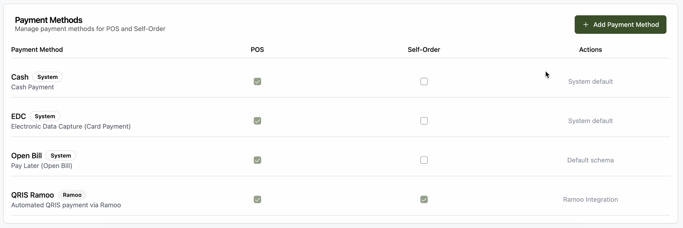 Metode pembayaran menentukan opsi yang muncul di kasir atau sistem self-order.