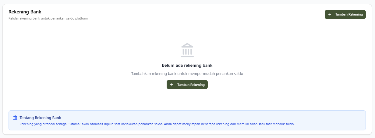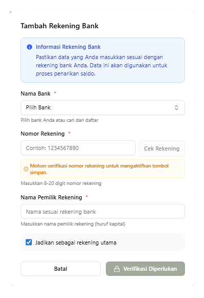 [!TIP] Kami menyarankan penggunaan rekening bank yang sama dengan bank utama operasional kamu untuk menghindari biaya administrasi antar-bank saat proses penarikan dana.