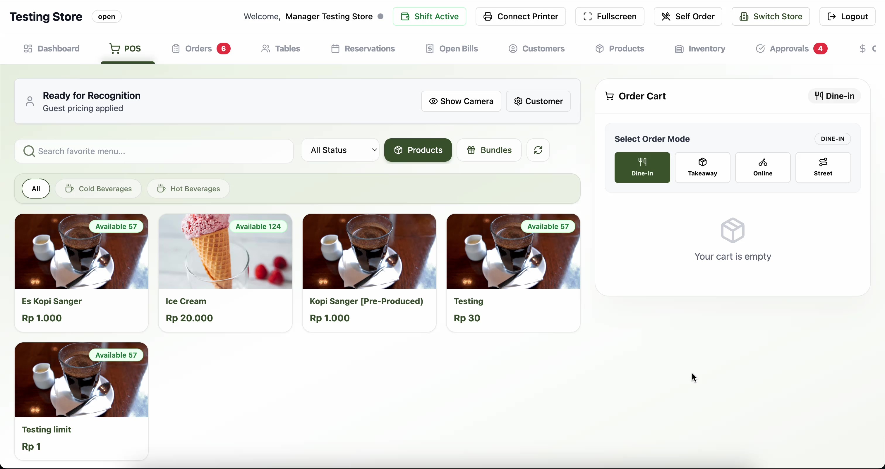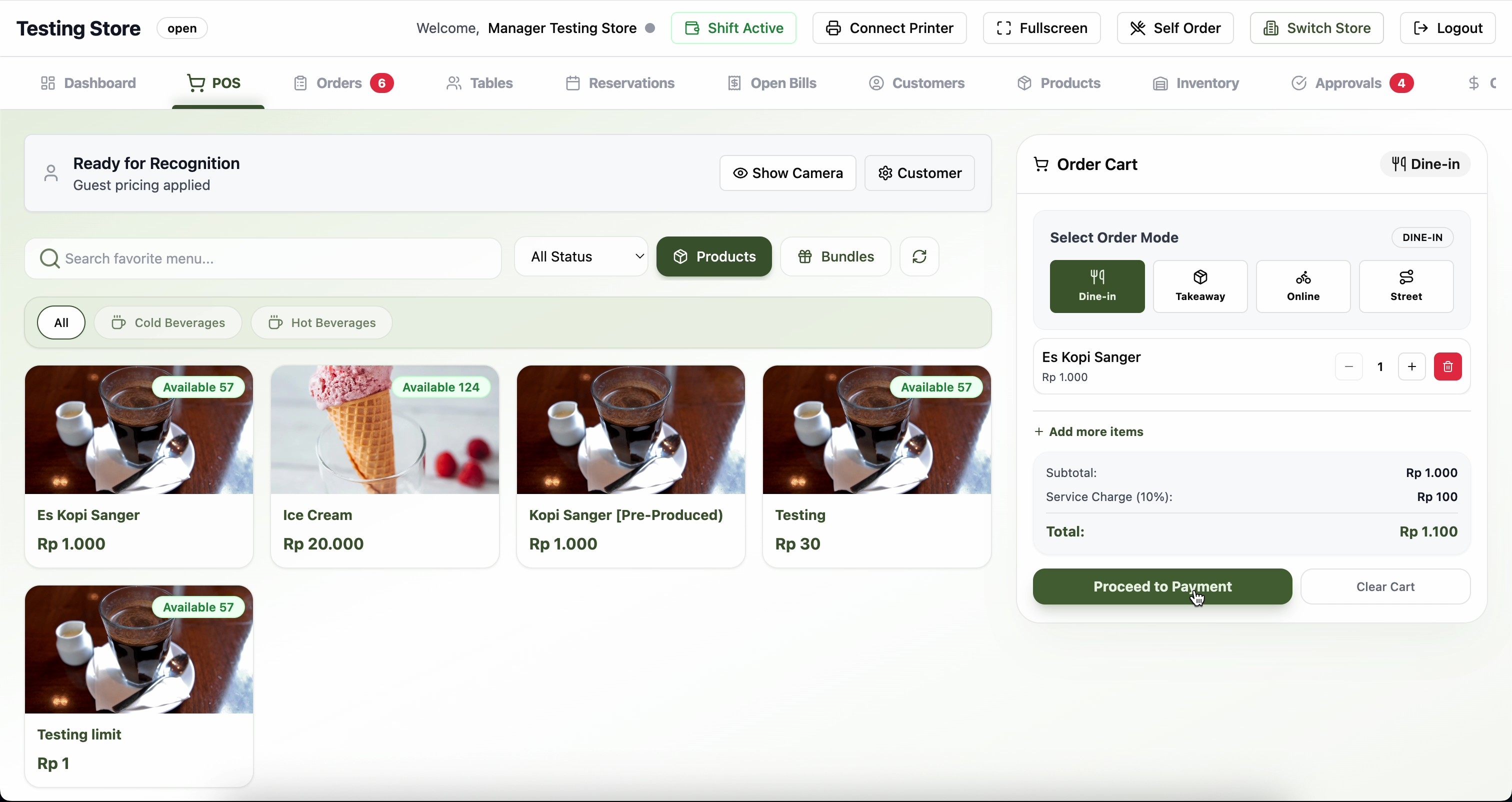 Pastikan mode Dine-In dipilih sebelum memulai pesanan.
