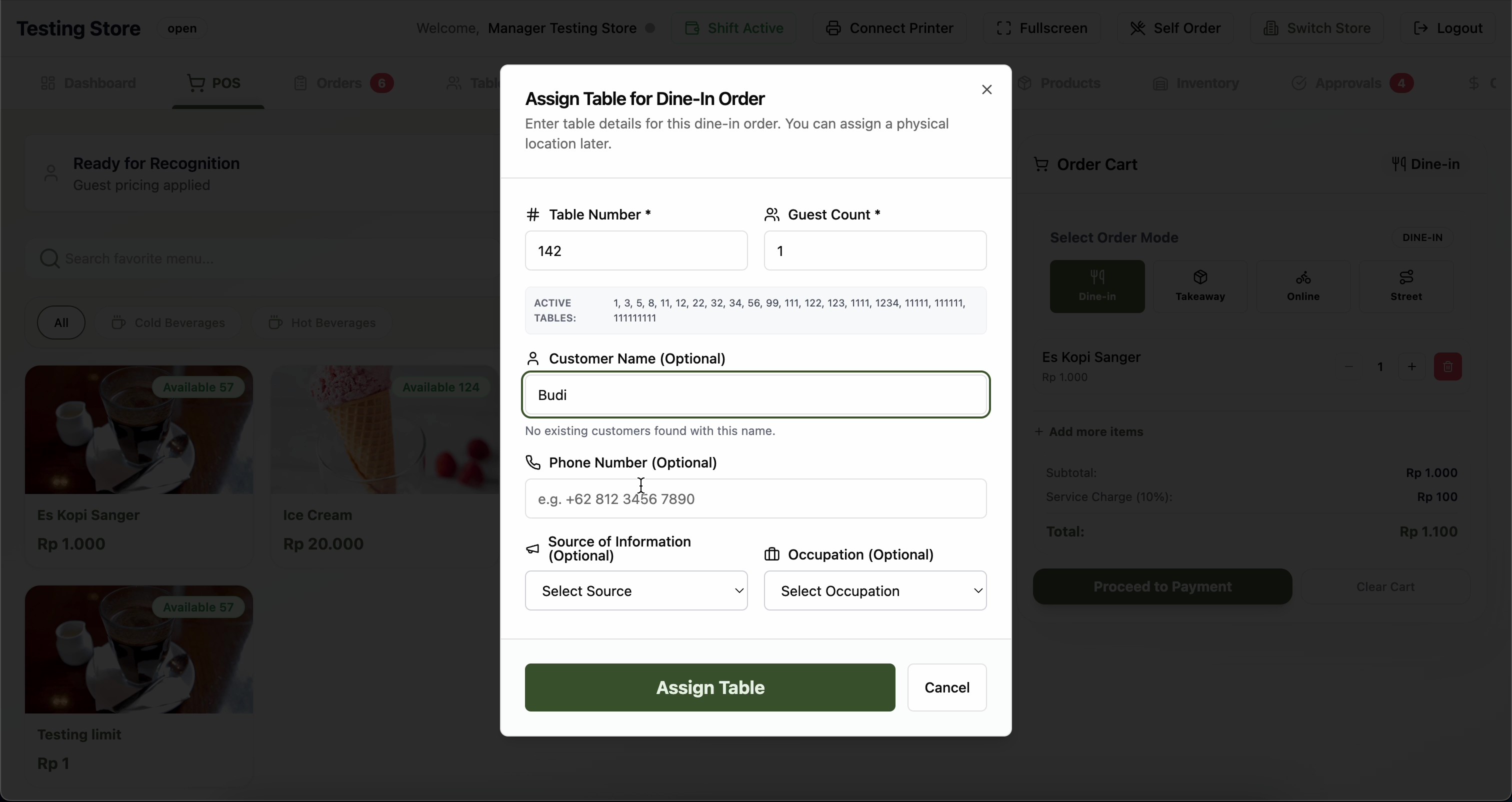 Popup "Assign Table for Dine-In Order" akan muncul.